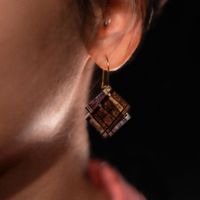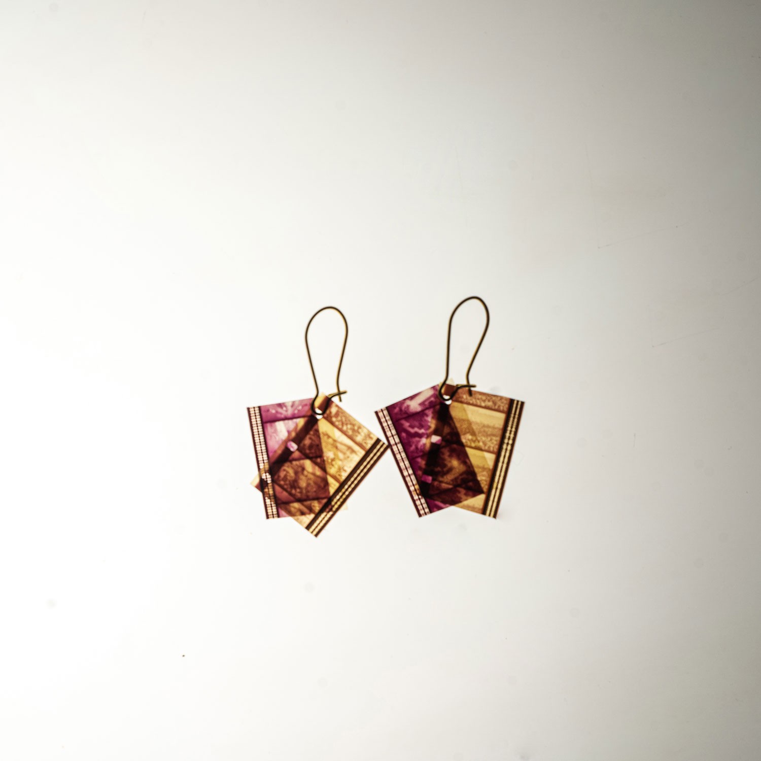These earrings have been made using 16mm found footage film sourced from forgotten godowns across the country. Each piece is unique having lived its own history. The film used ranges from the 50’s through the 90’s. The making happens at our studio in Mumbai and helps us sustain our artistic practice of working with celluloid and as an arts and performance space.